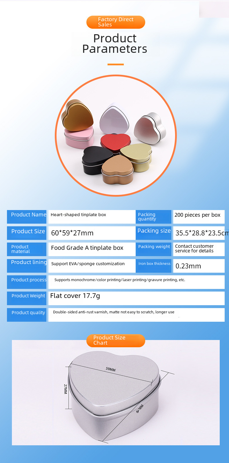 | Origin : Guangdong,No,Tinplate,60*59*27(H)mm,Alien,60*59*27(H)mm,Candy Box,60,27,59,0.23,Customizable,Liqiao can,Heart-shaped 7 color 60*59*27(H)mm,Yes,Silver flat cover 60*59*27(H)mm,Silver window 60*59*27(H)mm,Black flat cover 60*59*27(H)mm,Black window 60*59*27(H)mm,White flat cover 60*59*27(H)mm,White window 60*59*27(H)mm,Red flat cover 60*59*27(H)mm,Red window 60*59*27(H)mm,Pink flat cover 60*59*27(H)mm,Pink window 60*59*27(H)mm,Gold flat cover 60*59*27(H)mm,Golden window 60*59*27(H)mm,Champagne gold lid 60*59*27(H)mm,Champagne gold window 60*59*27(H)mm,Tuhao Jinping Cover 60*59*27(H)mm,Tuhao gold window 60*59*27(H)mm,ebay,Amazon,wish,AliExpress,Independent Station,LAZADA,Africa,Europe,South America,Southeast Asia,North America,Northeast Asia,Middle East,Yes,Yes,Candle Heart-Shaped Jar,Packing Box,Heart-shaped tin cans,Metal |