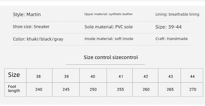 | Applicable gender : Male,In stock,C- 1360-1,Rubber,Youth (18-40 years old),Artificial PU,Round Head,Breathable,Flat heel,Martin boots,Flat heel,Sewing line,Retro,Ordinary thick,Solid color,Whole Order,No,No,Winter,Middle tube,Front lace-up,Textiles,Comfortable,PU,Martin boots,1,Cloth,No,1,White,Princess series,32*22*12,C- F838M khaki,C- 1360-1 Black,C- 1360-1 Gray,Fall 2023,3 days,39,40,41,42,43,44,Viscose shoes,No,Other,Martin boots,No |